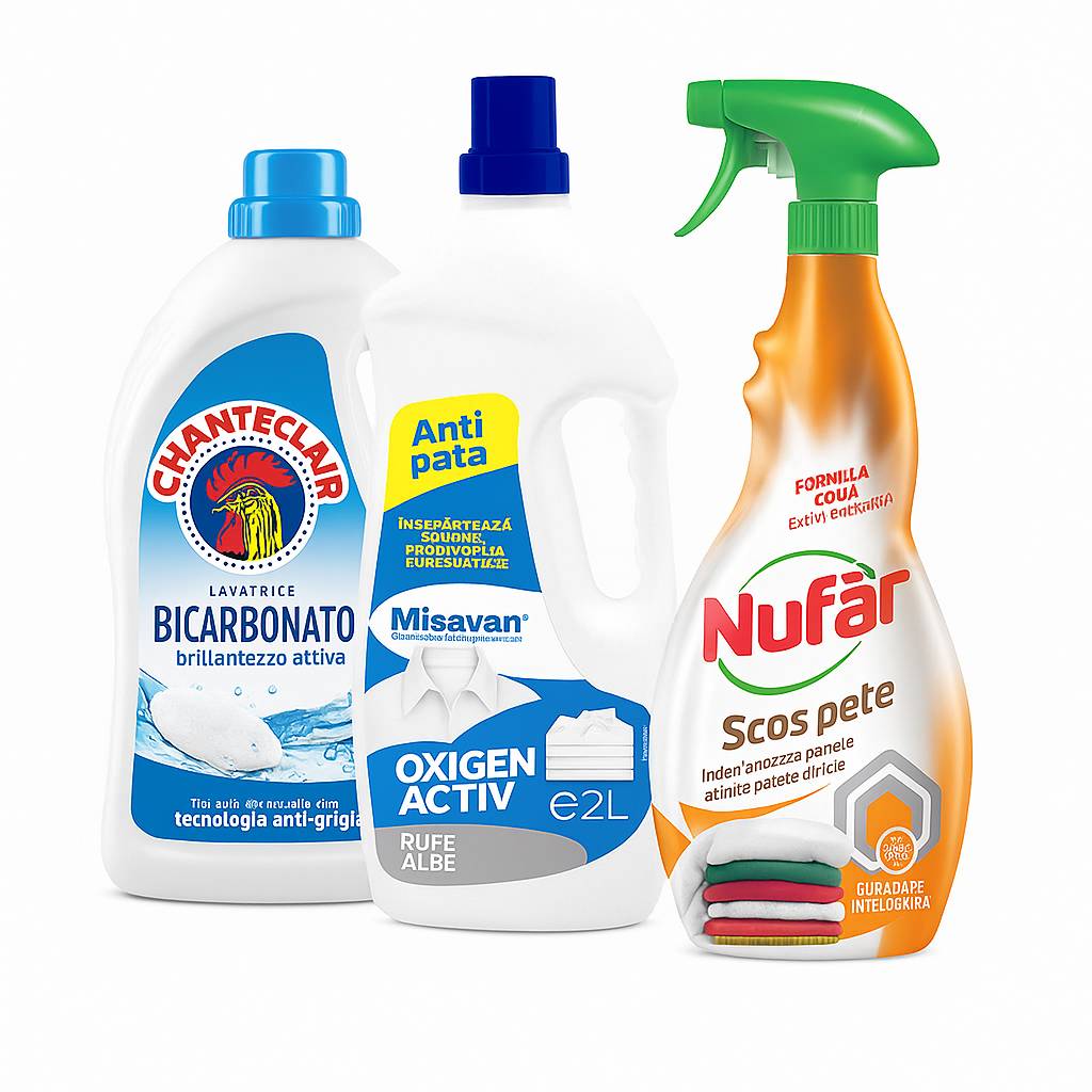 Descoperă o selecție eficientă de detergenți și soluții profesionale pentru îndepărtarea petelor, perfectă pentru o curățare impecabilă a hainelor și suprafețelor textile. În această imagine sunt prezentate trei produse de top: